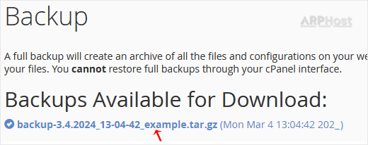 After the cPanel backup is finished, you will receive a notification. You can download backups from Backup > Download a Full Account Backup.