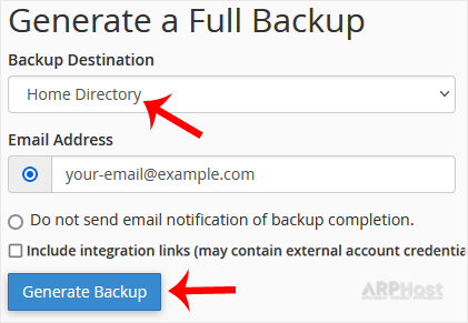4. From the drop-down menu, select Home Directory as the backup destination and enter your email to receive a notification when the backup is complete.