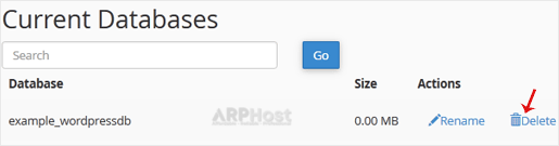3. Under Current Databases, you can see a list of all your databases. Locate the database you want to remove and click on Delete.