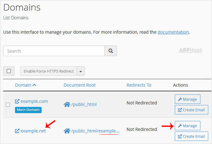 3. Locate the addon domain you want to remove and click Manage next to it.