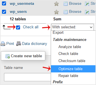 4. Scroll down and mark Check All. Click on the drop-down option and select Optimize tables.